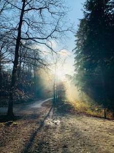 Op een mooie koude winterochtend loop ik door het bos, zie de zonnestralen door de bomen, de schittering tekent een glimlach om mijn gezicht. In de verte zie ik een man en vrouw beide in een elektrische rolstoel, benen bedekt met een ouderwets rood geruit flanellen dekentje, pompon muts over de oren getrokken hand in hand rijdend de zon tegemoet.